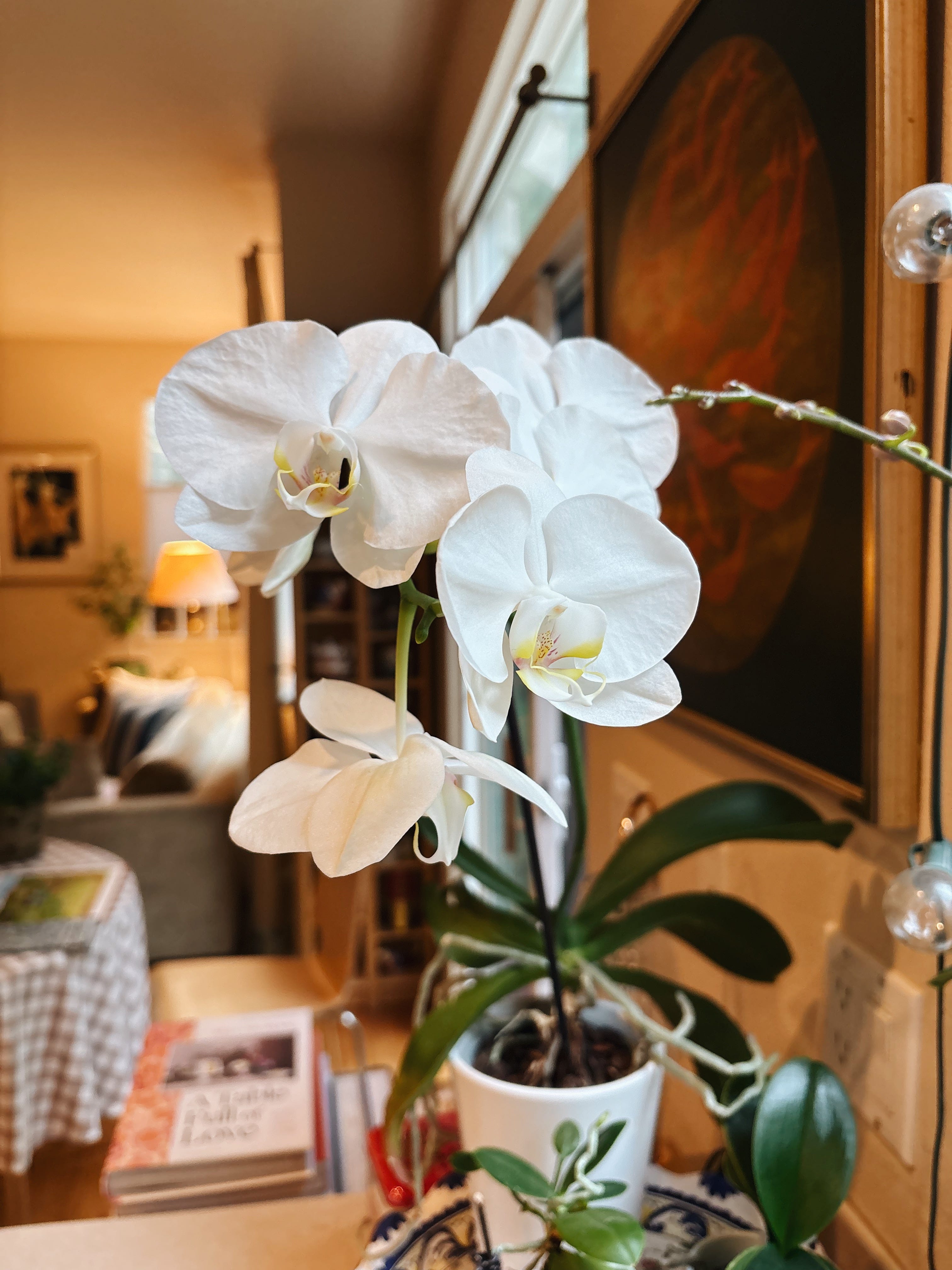 A friend gave me this orchid plant — she got it from another friend, who was having a hard time getting it to grow. I am not any kind of orchid whisperer, but I do have a Happy Window in which my orchids really seem to thrive. After a year or so of watering and living in this happy window…..it re-bloomed! Isn’t it so pretty!